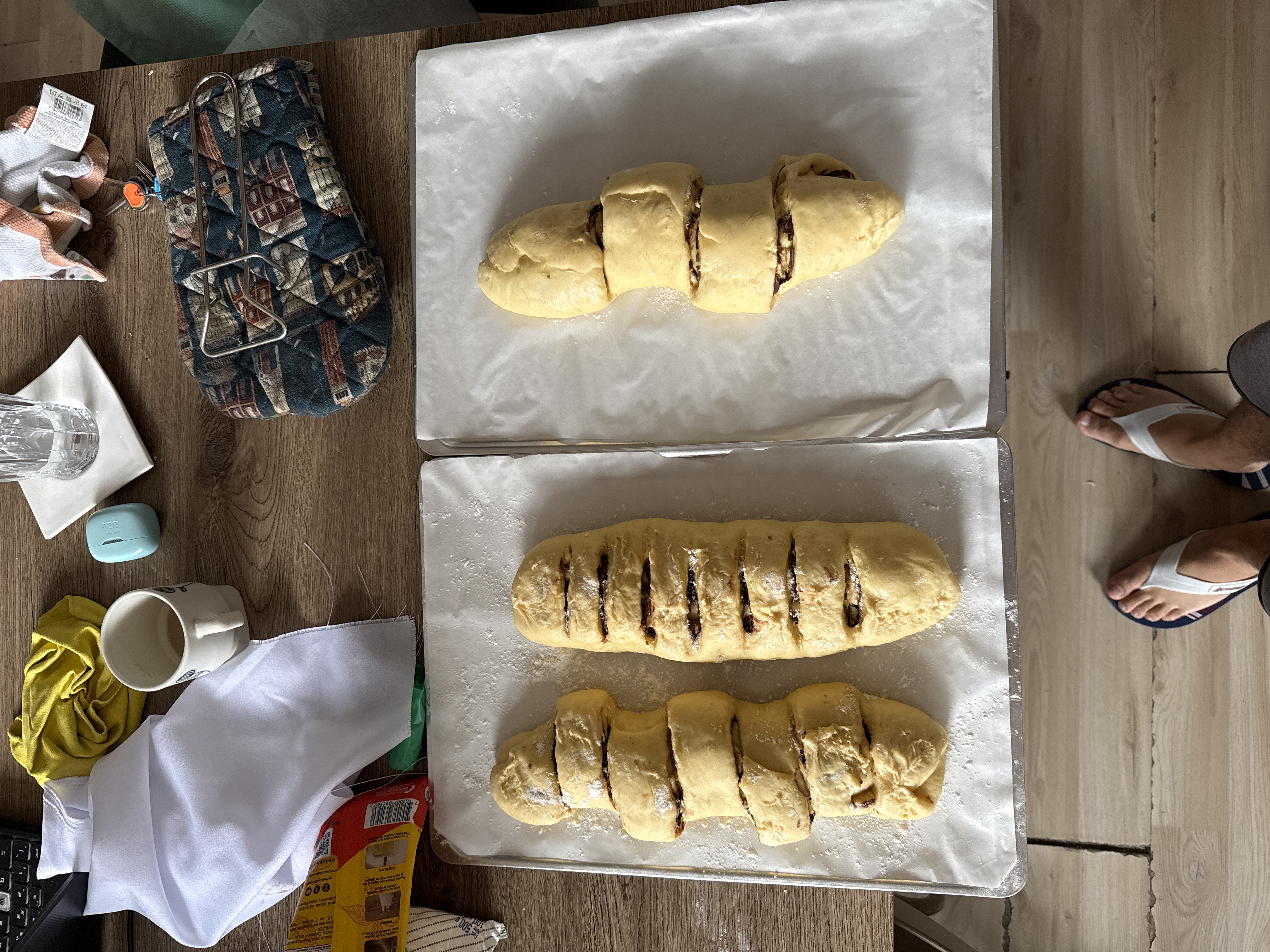 En esta ocasión hicimos tres panes, no cuatro. Amasamos la masa en un largor de 30 cm y 17 cm de ancho. Quedaron grandes, más de lo que deberían ser para la venta. El error fundamental es que este pan debería IR EN MOLDE. Otra cosa importante, el pan debe hornearse primero antes de poner el aluminio. El aluminio puede ponerse 10 minutos después.